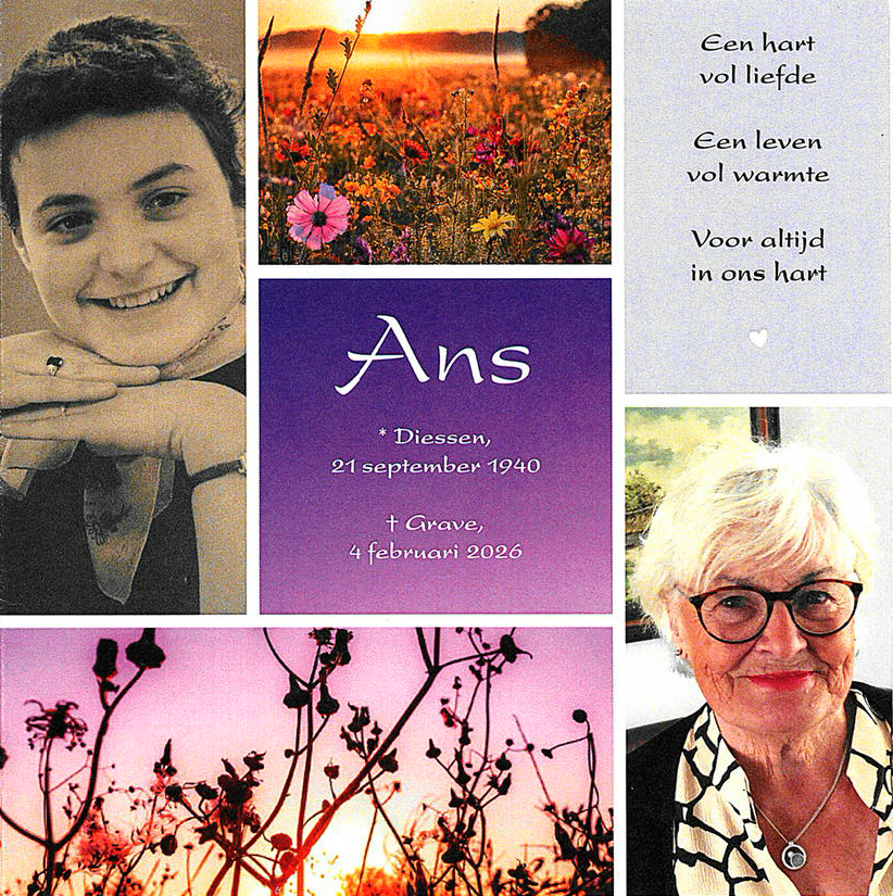 Woensdag 4 februari is op 85 jarige leeftijd overleden Ans van Riel, weduwe van Cor Bloemers